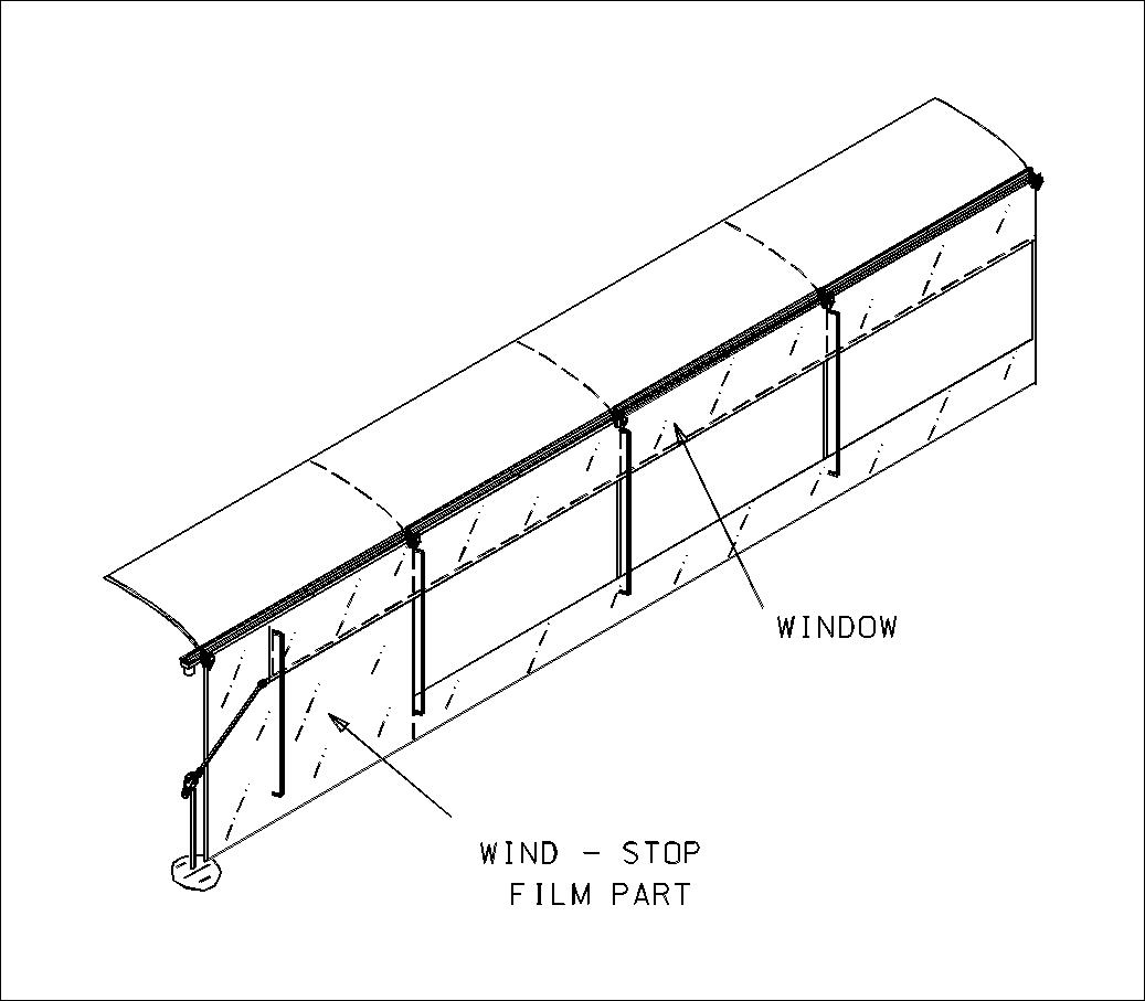روکش پلاستیکی ثابت (wind-stop film part) در انتها و ابتداي دریچه رولآپ پلاستیکی جهت جلوگيري از داخل آمدن باد در زمان بسته بودن پنجره وجود دارد. پنجره توسط كليپ نگهدارنده ثابت ميگردد و توسط موتور گيربوكس تلسكوپي هدايت ميشود.